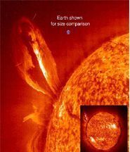 Looping eruptions on the Sun, like this one (right)  on July 24, 1999, create antimatter. Earth is shown for size comparison.
