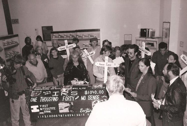 Eszter Freeman has in the past staged more dramatic protests than just withholding her tax payment. She recalls one from 1990 (pictured here, with Freeman at the center in black), in which she made and decorated a coffin as the legal tender she used for that's year's payment.