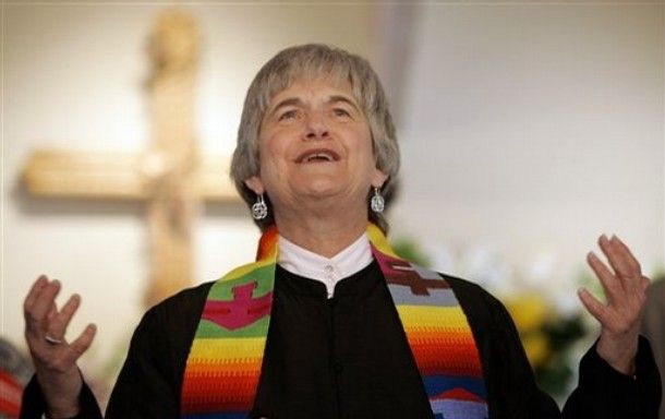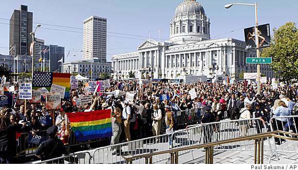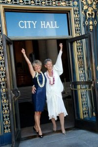 Shortly after the Supreme Court decision was announced, KRCB was able to reach Jane Spahr (right), the Presbyterian minister who was threatened with internal sactions from the church for marrying two same sex couples in Sonoma County. Spahr was among the hundreds of protesters outside San Francisco City Hall (see photo below) and described the scene as she and dozens of others prepared to be arrested as part of that demonstration.