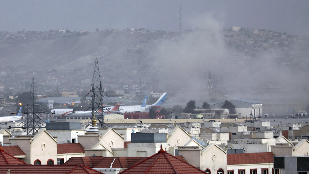 Smoke rises from an explosion outside the airport in Kabul. Gunfire and at least one other bombing has taken place across the Afghan capital on Thursday. Wali Sabawoon/AP hide caption