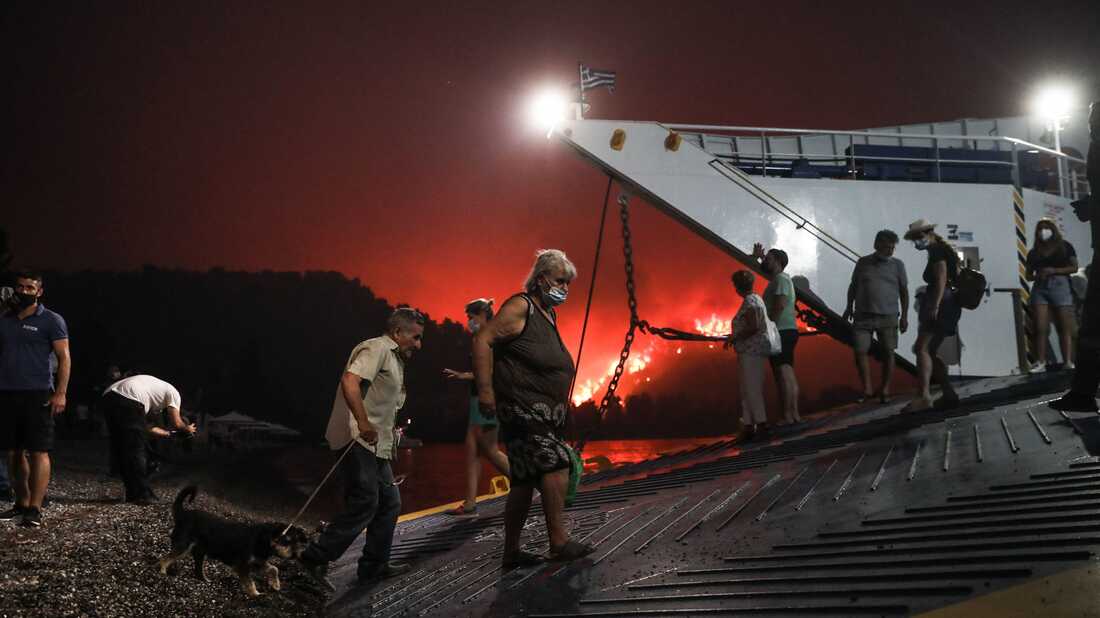 People board a ferry prior to an evacuation as a wildfire approaches the seaside village of Limni, on the island of Evia, Greece, on August 6, 2021.