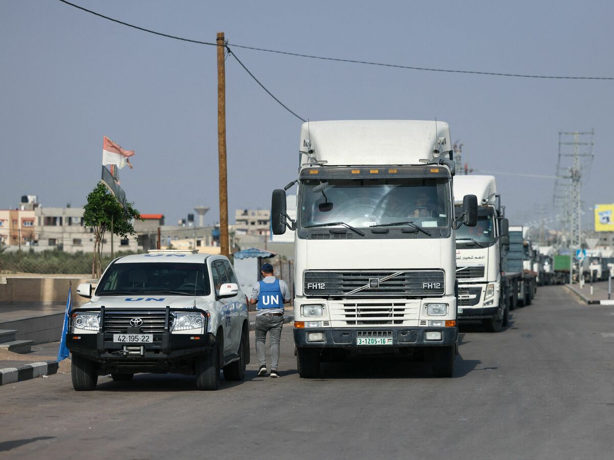 Empty trucks wait for aid arriving for the Gaza Strip at the Rafah crossing with Egypt on October 22, 2023. The territory is facing a 'catastrophic' humanitarian crisis in the war that has followed Hamas's attack against Israel.