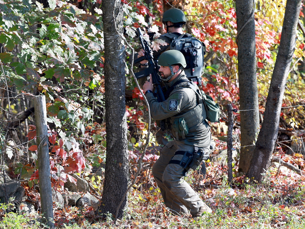 Law enforcement officials conduct a manhunt for suspect Robert Card following a mass shooting on October 27, 2023 in Monmouth, Maine. Police are actively searching for a suspect, Army reservist Robert Card, who allegedly killed 18 people in a mass shooting at a bowling alley and restaurant in Lewiston, Maine.