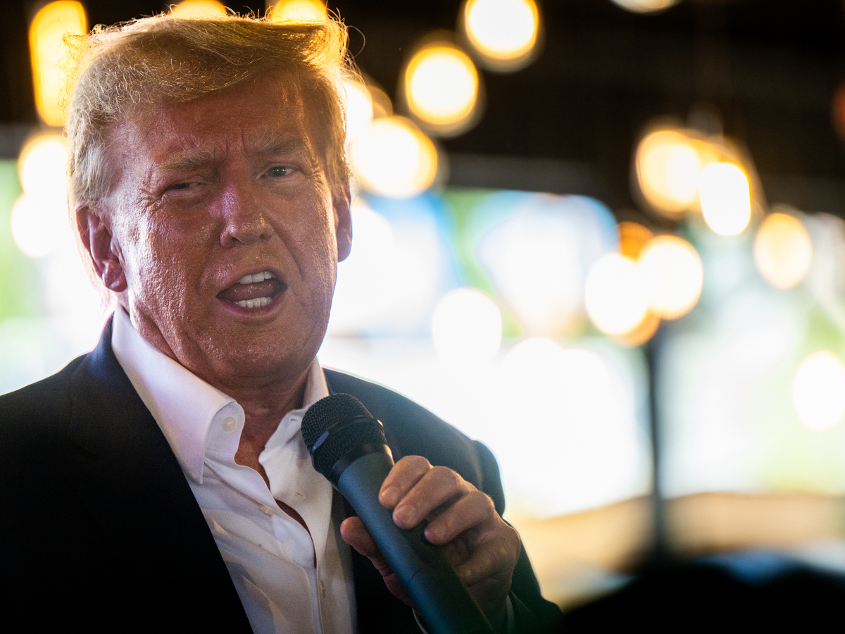 Republican presidential candidate and former U.S. President Donald Trump speaks during a rally at the Steer N' Stein bar at the Iowa State Fair on August 12, 2023 in Des Moines, Iowa. Brandon Bell/Getty Images hide caption