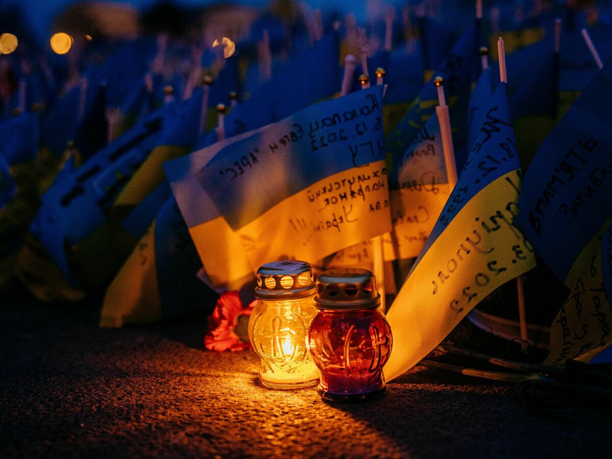 Candles are lit in front of Ukrainian flags in Kyiv on Friday. Each is dedicated to a serviceman killed during the Russian invasion of Ukraine.