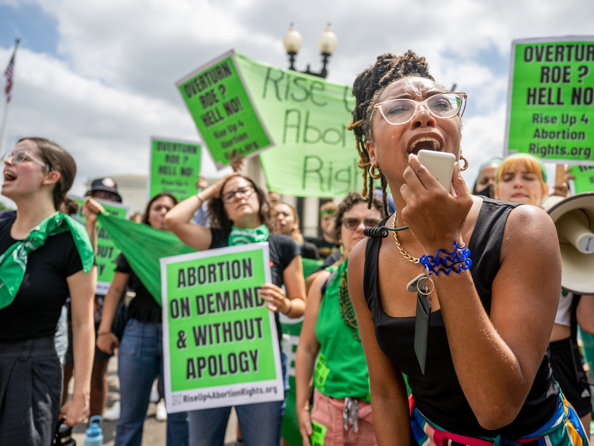 WASHINGTON, DC - JUNE 24: Abortion rights demonstrator Elizabeth White leads a protest. June 24, 2022 in Washington, DC. The Court's decision in Dobbs v Jackson Women's Health overturned the landmark 50-year-old Roe v Wade case and erased a federal right to an abortion. (Photo by Brandon Bell/Getty Images) Brandon Bell/Getty Images hide caption