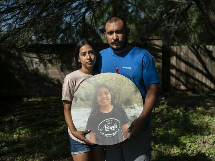 Kimberly Mata-Rubio and Felix Rubio, photographed in August, 2022 with a photo of their daughter Alexandria "Lexi" Aniyah Rubio. The 10 year old was killed by a mass shooter in Uvalde, Texas in May, 2022. Mata-Rubio is running for mayor of Uvalde. Veronica G. Cardenas/NPR hide caption