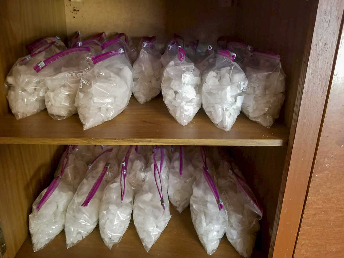 Evidence seized from a drug trafficking operation in central California in early 2020 included methamphetamine and fentanyl with a street value of $1.5 million, authorities said. Tulare County Sheriff's Office via AP hide caption