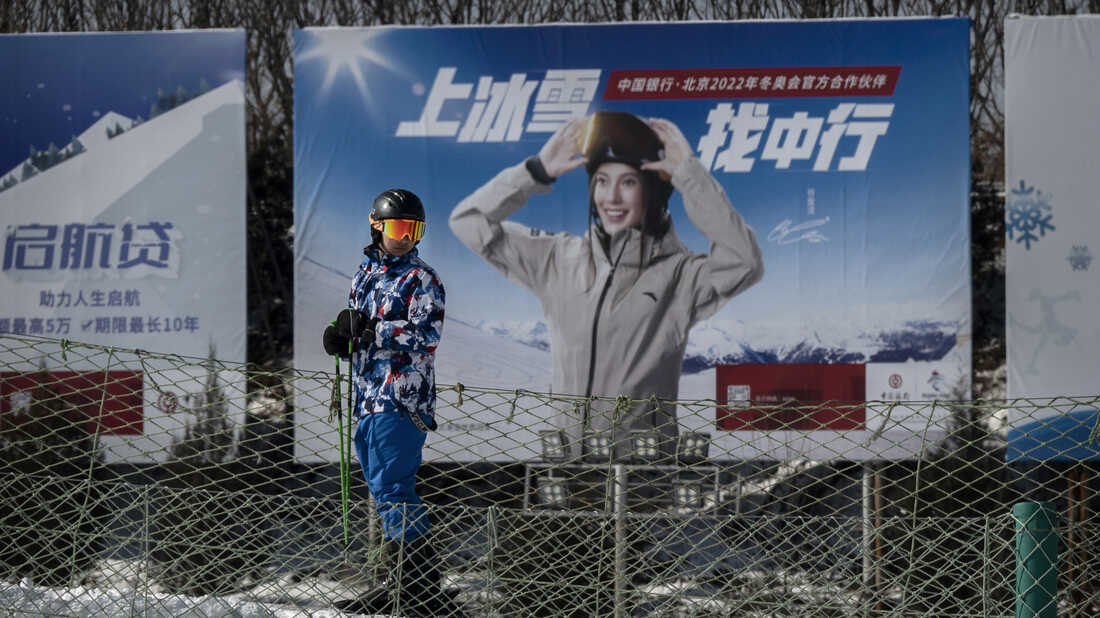 A skier passes a billboard showing American-born freestyle skier Eileen Gu, or Gu Ailing, who competes for China. Kevin Frayer/Getty Images hide caption