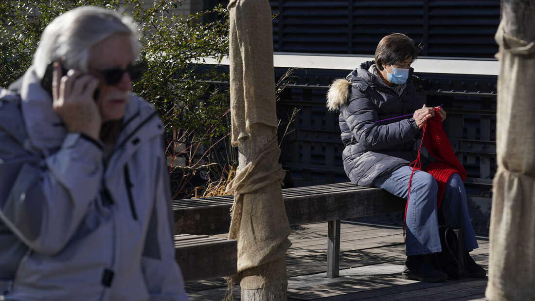 A woman wears a mask while knitting in a park in New York, Wednesday, Feb. 9, 2022. New York Gov. Kathy Hochul announced last Wednesday that the state will end a COVID-19 mask mandate requiring face coverings in most indoor public settings, but will keep masking rules in place in schools for now.