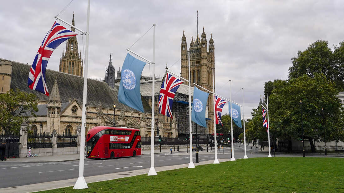 British and U.N. flags fly in London on Sunday, ahead of the upcoming U.N. climate conference in Glasgow, Scotland.