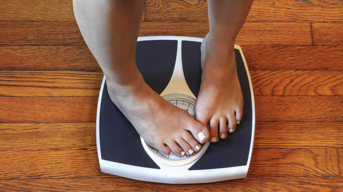 A woman stands on a scale. Rick Elkins/Getty Images hide caption