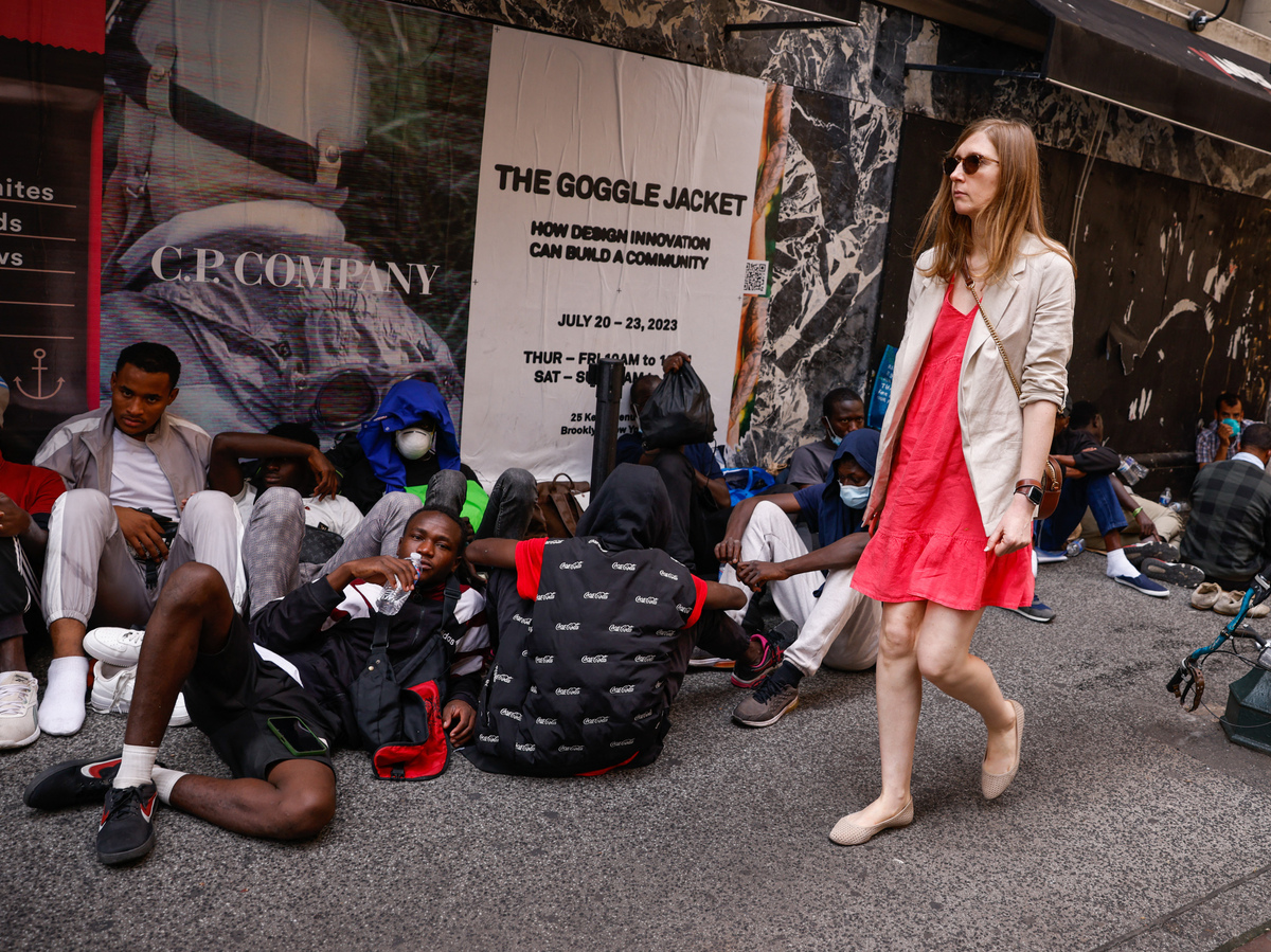 New York City, July 31, 2023. Newly arrived migrants wait outside the Roosevelt Hotel in Midtown. It has been turned into a migrant reception center, to try to secure temporary housing. (Photo by KENA BETANCUR / AFP) (Photo by KENA BETANCUR/AFP via Getty Images)