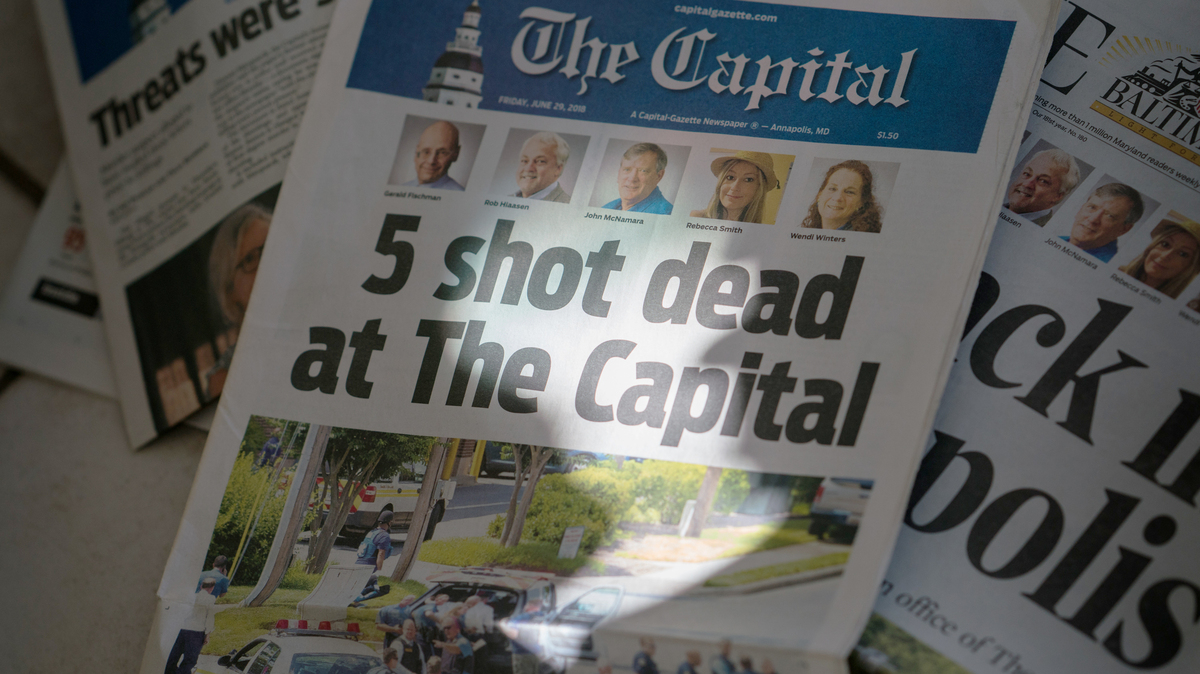 The front page of The Capital Gazette newspaper the day after a mass shooting occured at the paper's office.