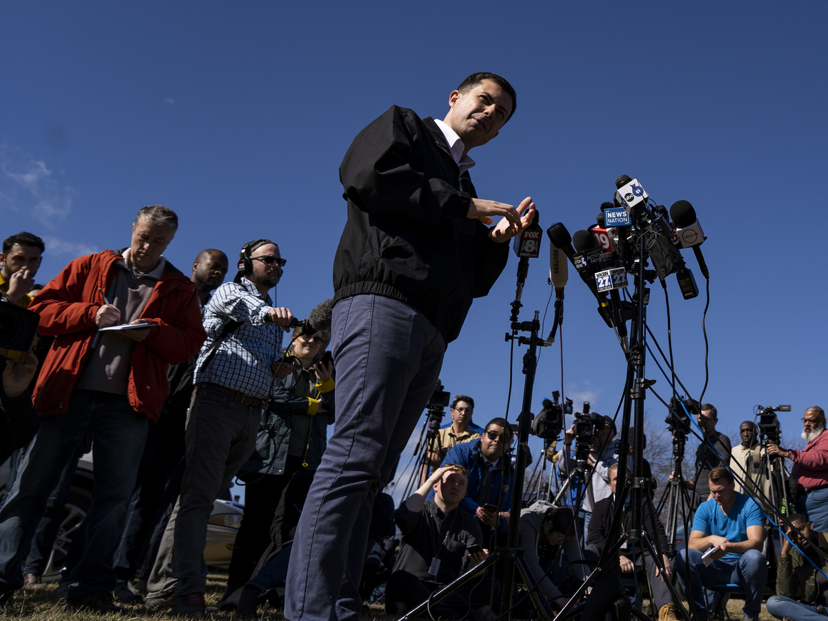 U.S. Transportation Secretary Pete Buttigieg delivers remarks to the press as he visits the site of the Norfolk Southern train derailment on February 23, 2023 in East Palestine, Ohio. Michael Swensen/Getty Images hide caption