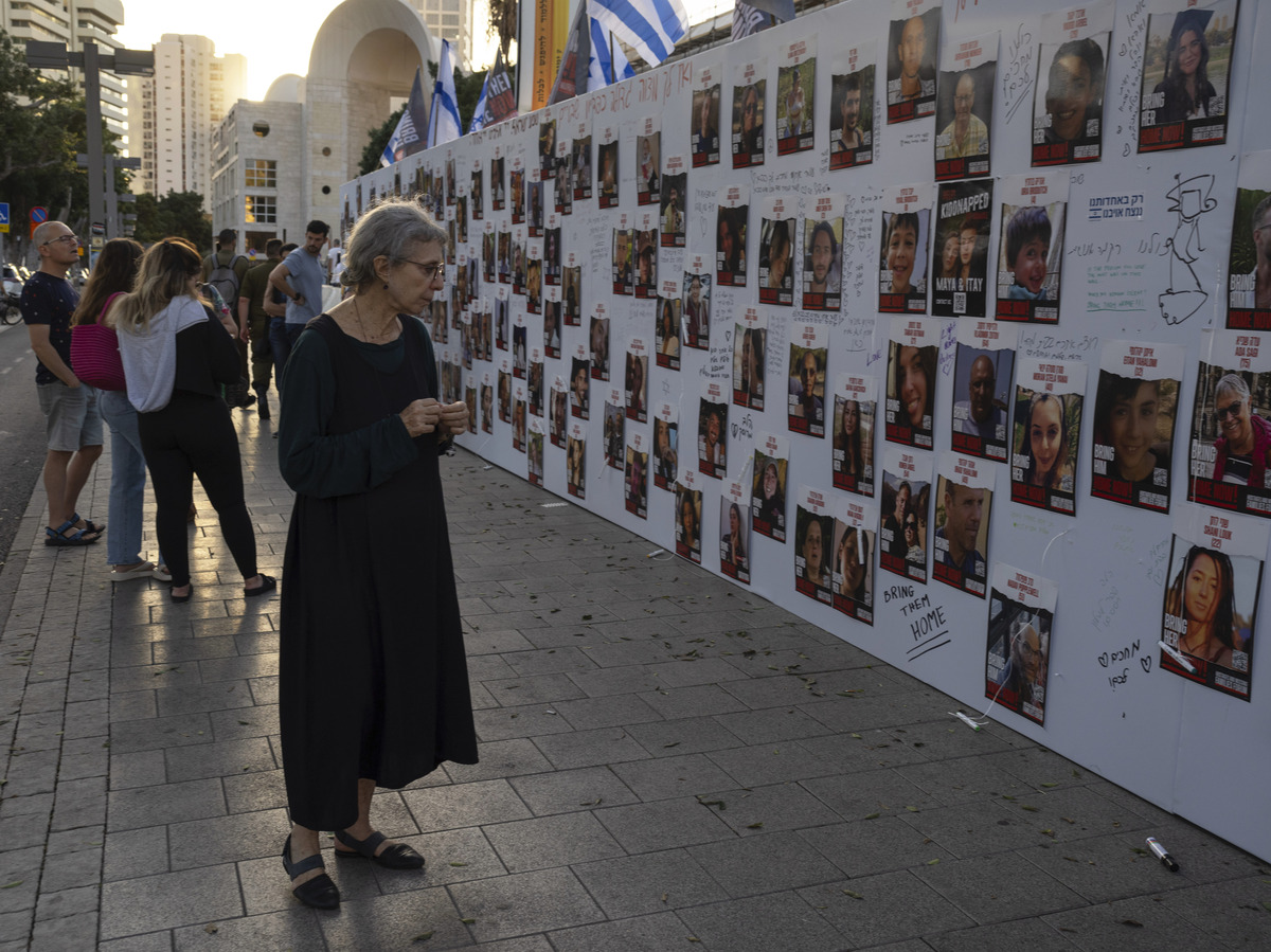 An Israeli woman looks at photos of those who are missing and held captive in Gaza, displayed on a wall in Tel Aviv, on Friday, Oct. 20, 2023. (AP Photo/Petros Giannakouris) Petros Giannakouris/AP hide caption