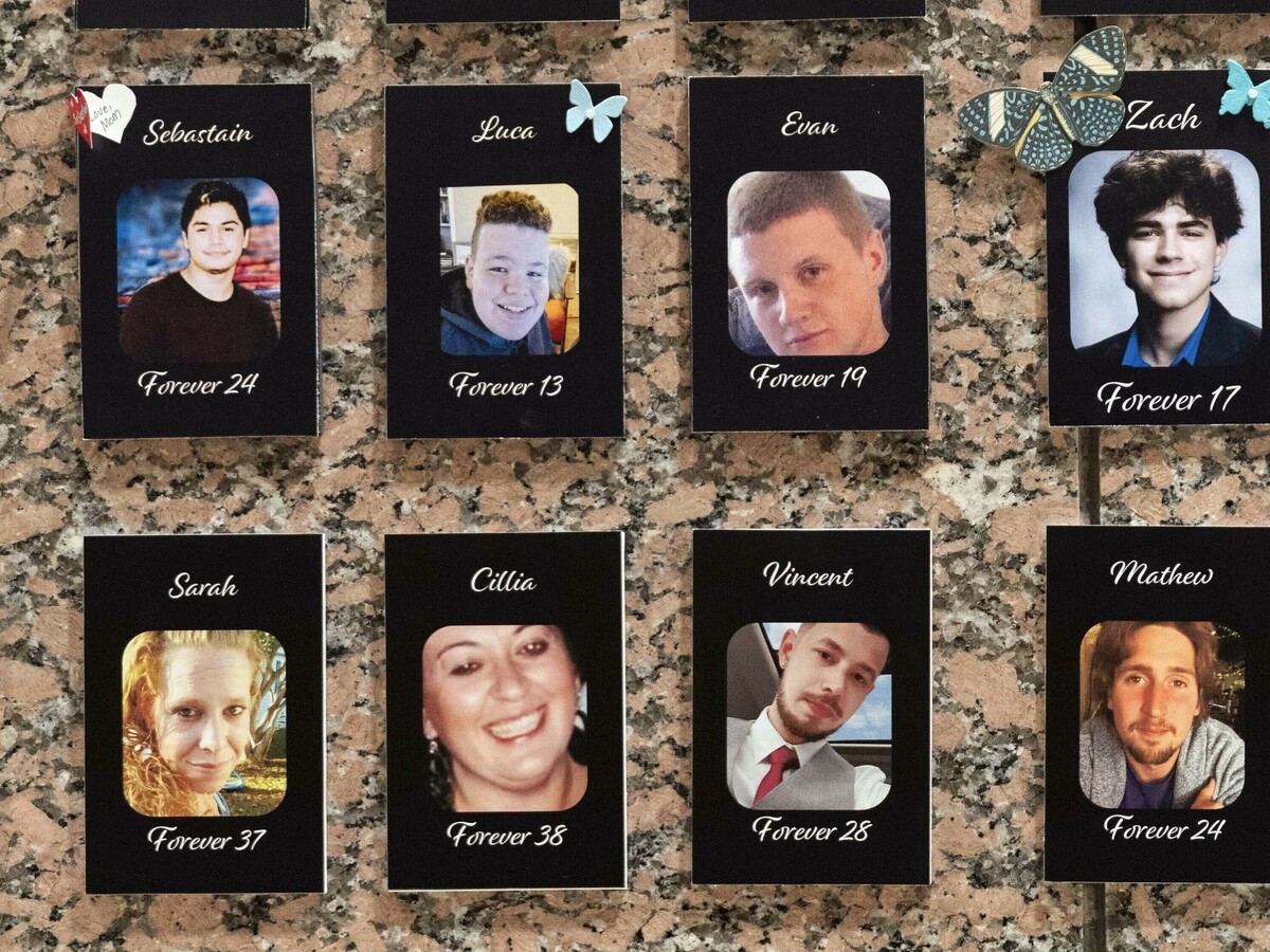 Photographs of people who had died from drugs are on display during the Second Annual Family Summit on Fentanyl at DEA Headquarters in Washington, Tuesday, Sept. 26, 2023.