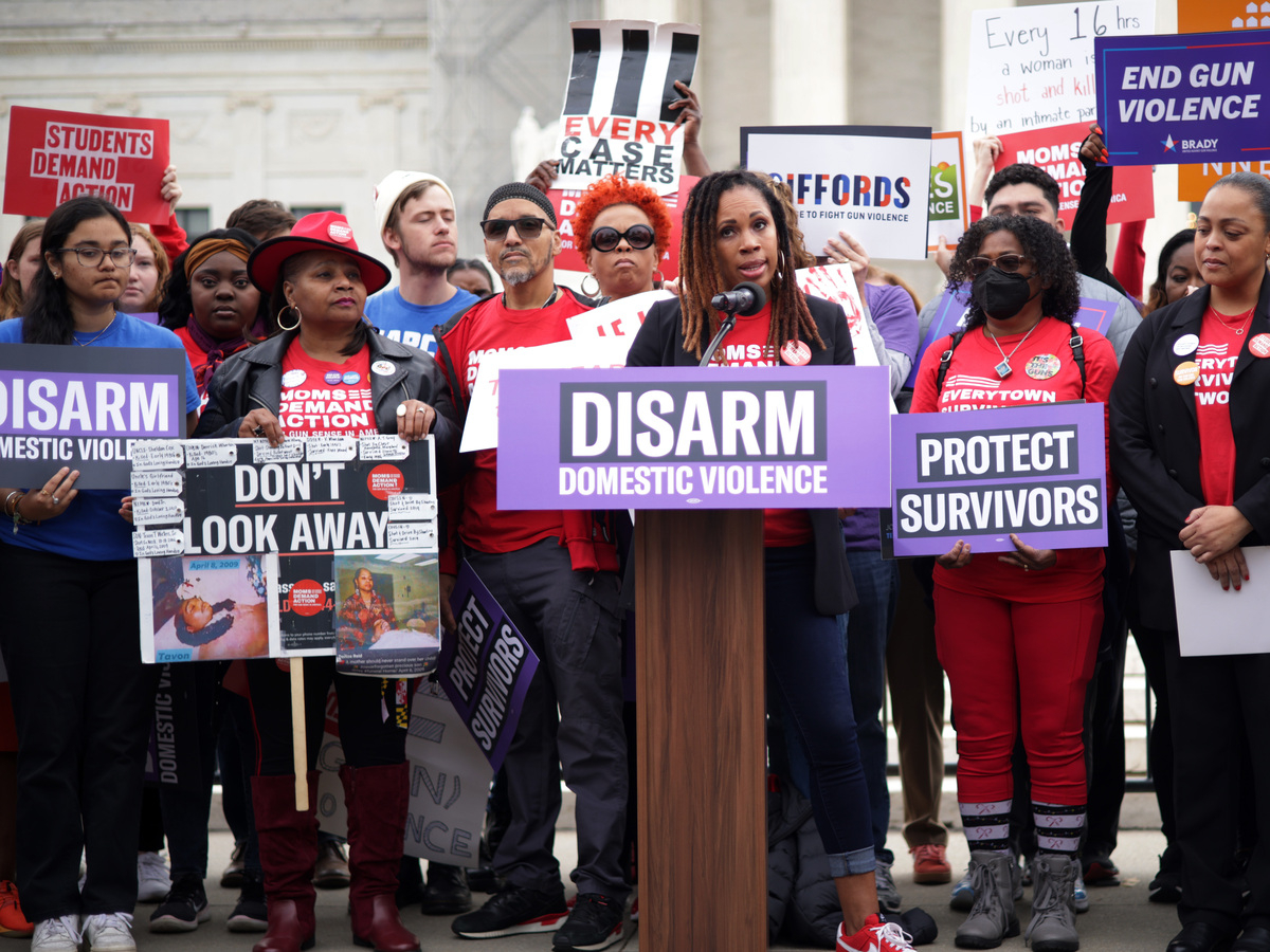 Angela Ferrell-Zabala of Moms Demand Action spoke outside of the U.S. Supreme Court at a gun-control rally on Tuesday, as the Court was hearing arguments for a case about whether domestic violence offenders are protected by the Second Amendment to own guns.
