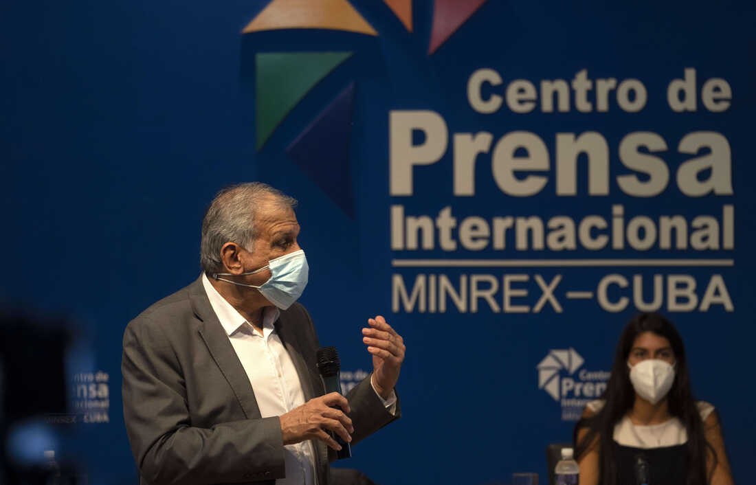 Mitchell Joseph Valdes Sosa, the director of the Cuban Neurosciences Center, gives a press conference about symptoms reported by U.S. and Canadian diplomats in 2016 and 2017, commonly referred to as the "Havana Syndrome," in Havana, Cuba, Monday, Sept. 13, 2021. Ramon Espinosa/AP hide caption