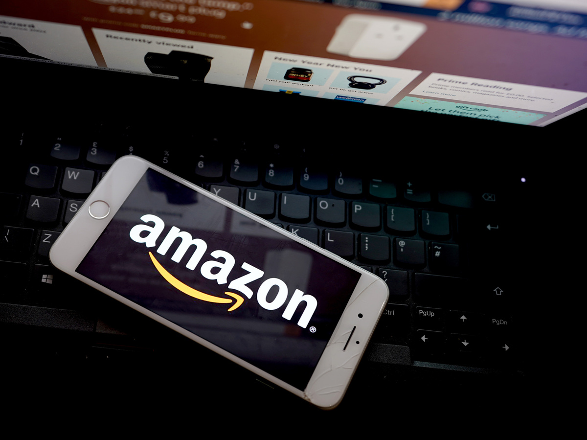 The Amazon logo is displayed on a phone with the retailer website on a laptop screen in the background. Amazon in the largest online retailer in the world.