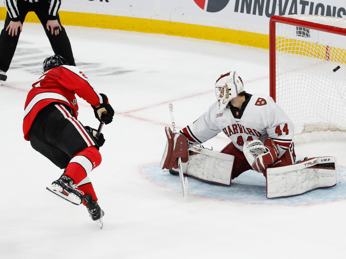 Aidan McDonough of the Northeastern Huskies scores the winning goal (3-2) against Mitchell Gibson of the Harvard Crimson in the championship game of the Beanpot Hockey Tournament on February 13, 2023 in Boston. Gibson is now trying to make it into the NHL for the Washington Capitals. Rich Gagnon/Getty Images hide caption