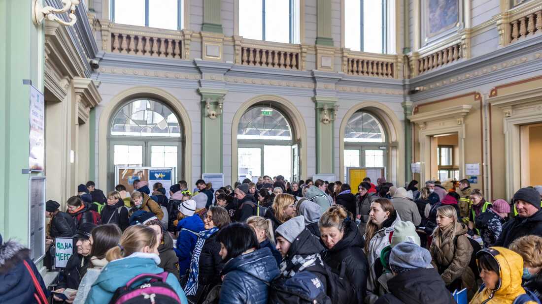 Refugees from Ukraine are seen standing in the line for free train tickets in the hall of the main railway station in Przemysl, southeastern Poland, on March 20, 2022.