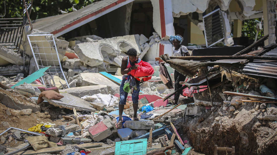 Locals recover their belongings from their homes destroyed in the earthquake in Camp-Perrin, Les Cayes, Haiti, Sunday, Aug. 15, 2021.