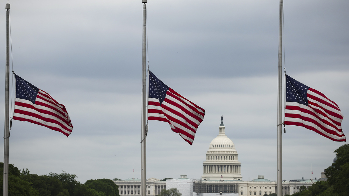 Flags at the base of the Washington Monument fly at half staff to mark one 1 million deaths attributed to COVID-19.