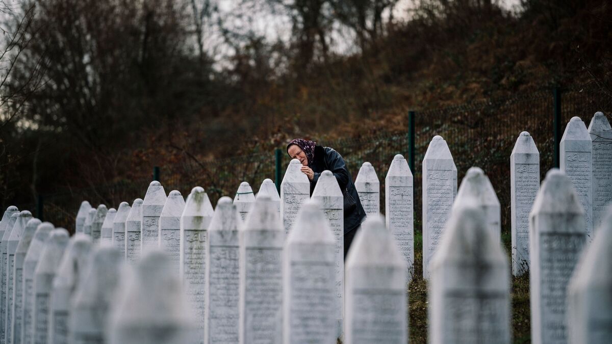 A Bosnian woman expresses her grief as she touches a gravestone at a cemetery for the victims of the 1995 Srebrenica Massacre that killed an estimated 8,000 Bosniaks.