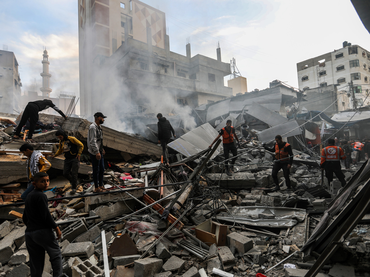 Palestinian citizens inspect destruction from air strikes on Dec. 4 in Khan Younis, Gaza.