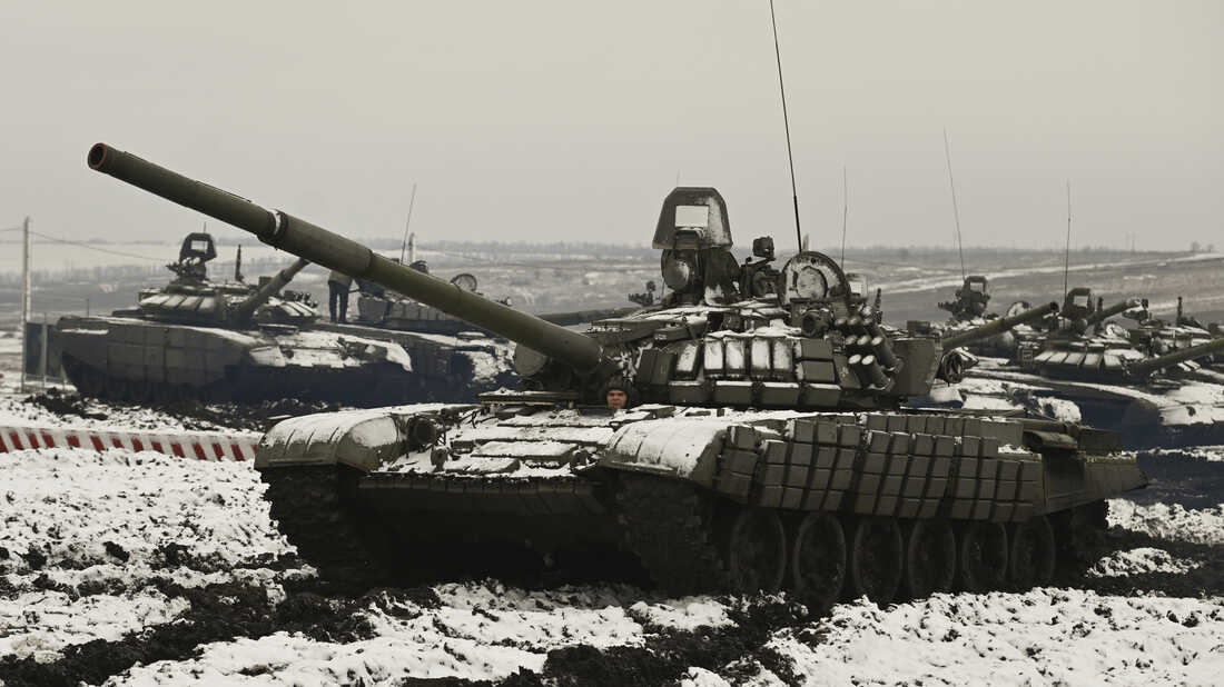 Russian tanks take part in training drills in southern Russia this week as Russia rejects Western complaints about its troop buildup near Ukraine. AP hide caption