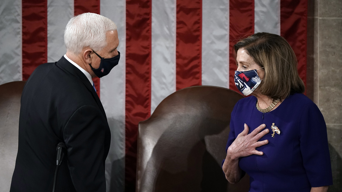 Speaker of the House Nancy Pelosi, D-Calif., and Vice President Mike Pence talk before a joint session of the House and Senate convenes to count the Electoral College votes cast in the 2020 presidential election. (AP Photo/J. Scott Applewhite) J. Scott Applewhite/AP hide caption