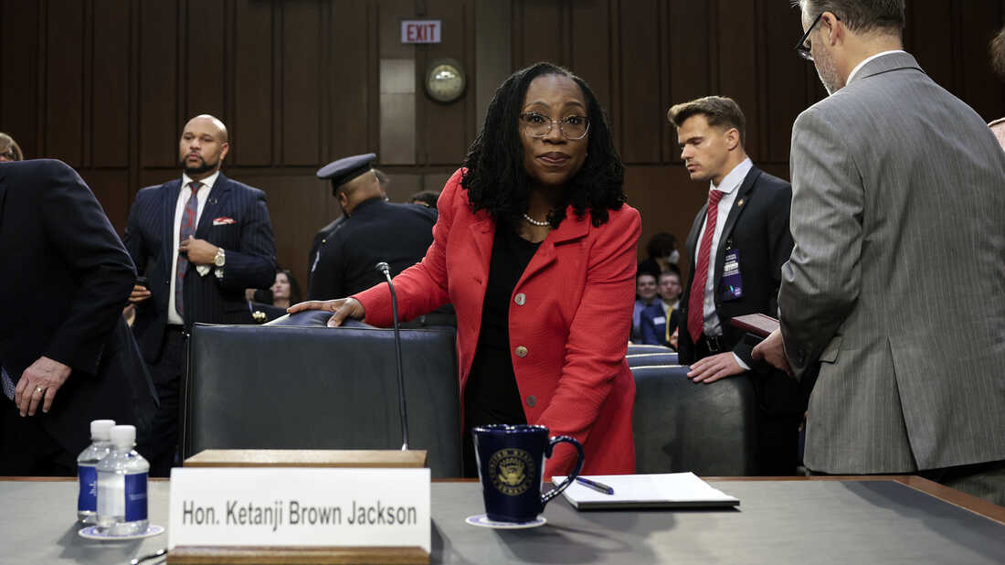 U.S. Supreme Court nominee Judge Ketanji Brown Jackson arrives for her confirmation hearing before the Senate Judiciary Committee in the Hart Senate Office Building on Capitol Hill March 22, 2022 in Washington, DC. Anna Moneymaker/Getty Images hide caption
