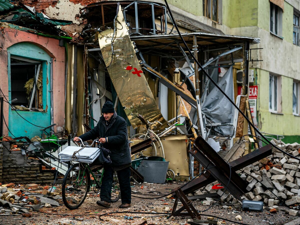 A local resident pushes his bicycle down a street in Bakhmut, Ukraine in January. Despite heavy shelling, some civilians continue to live in the city.