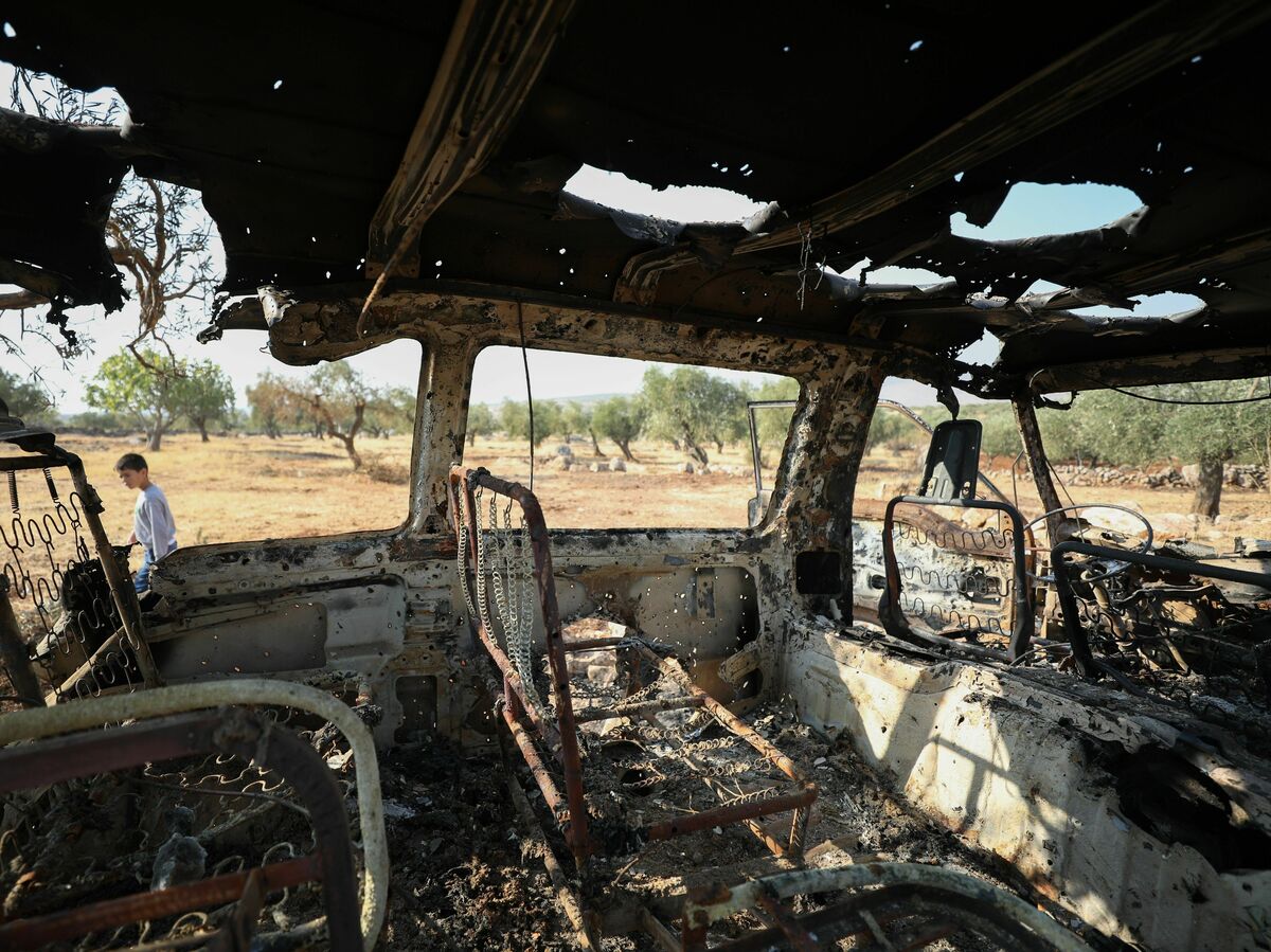 A photo taken on October 27, 2019 shows the burnt van that Barakat Ahmad Barakat says he was in when it was targeted by U.S. forces the night of the raid on ISIS leader Baghdadi's compound.