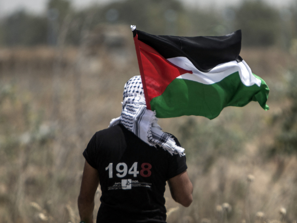 A Palestinian youth waves the national flag as Israeli military digs in search of smuggling tunnels at the border east of Gaza city. MAHMUD HAMS/AFP via Getty Images hide caption