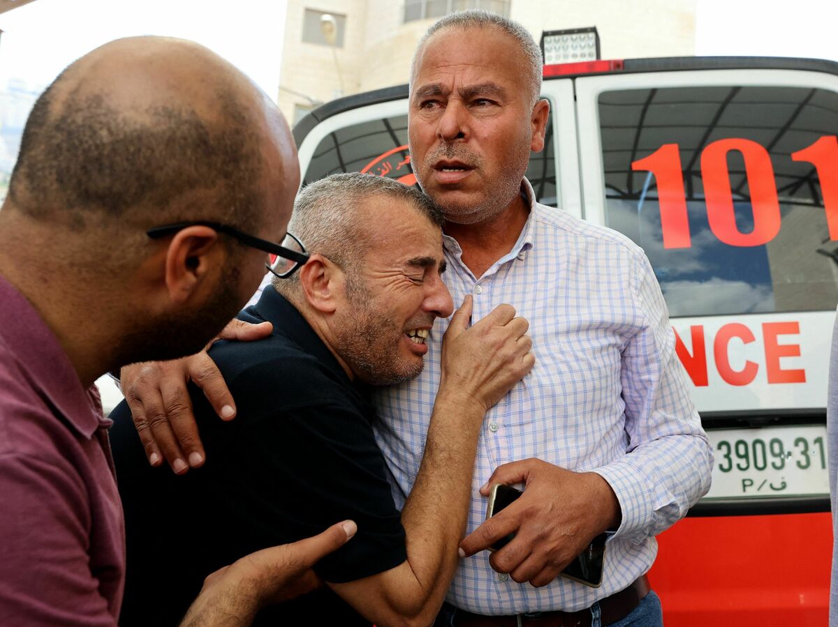 A relative grieves as the bodies of Ibrahim Wadi and his son Ahmed Wadi, two of four people killed by Jewish settlers are taken from the hospital for burial in the town of Qusra, south of the West Bank city of Nablus on October 12, 2023.