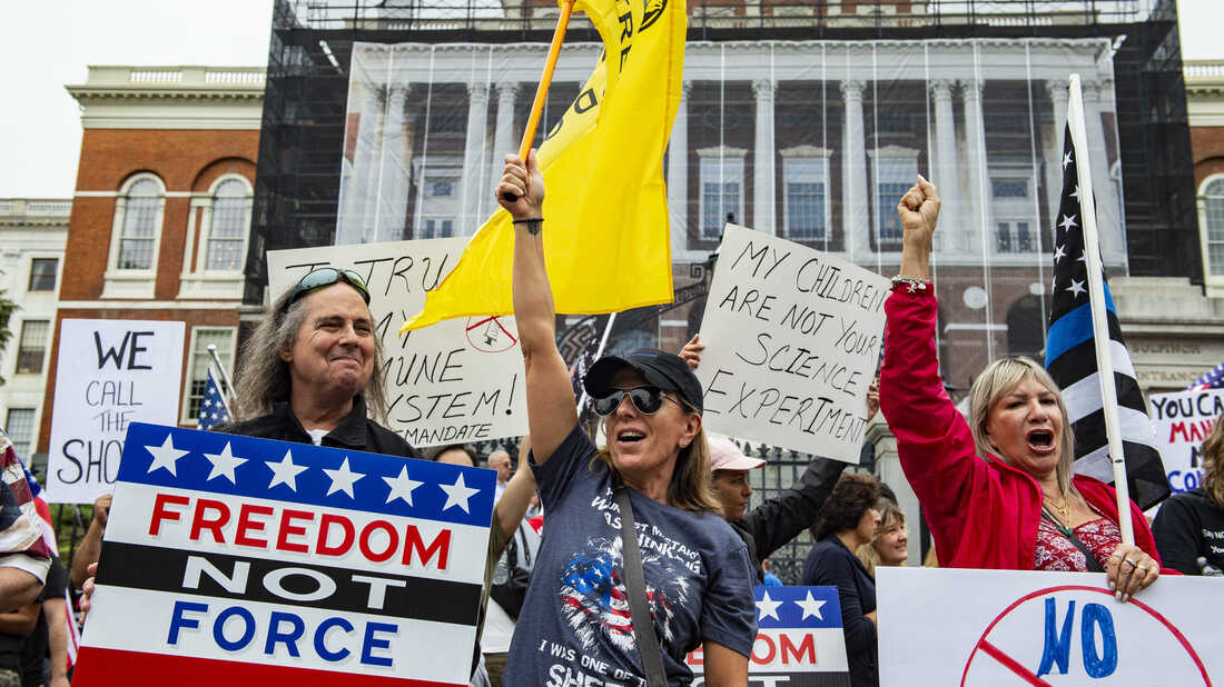 Demonstrators gather outside the Massachusetts State House in Boston to protest Covid-19 vaccination and mask mandates.