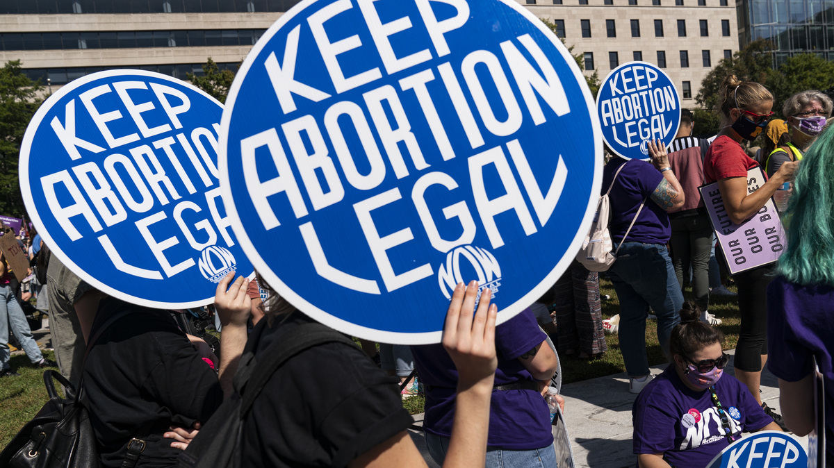 Women rights activists hold up signs as they gather in Washington, DC. to protest the new abortion law in Texas. While she was instrumental to the early abortion-rights movement, many in the crown may not have known the name Pat Maginnis. Joshua Roberts/Getty Images hide caption