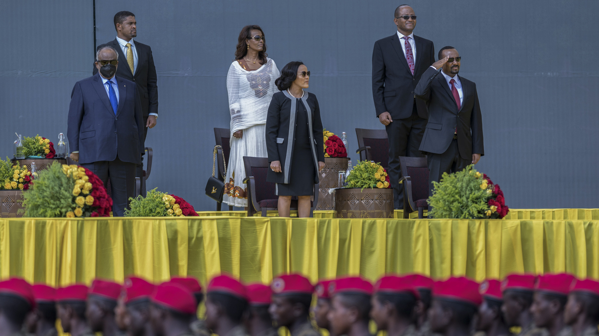 Ethiopia's Prime Minister Abiy Ahmed, right, First Lady Zinash Tayachew, center, and Djibouti's President Ismail Omar Guelleh, left, attend Abiy's inauguration ceremony after he was sworn in for a second five-year term, in the capital Addis Ababa, Ethiopia Monday, Oct. 4, 2021. Mulugeta Ayene/AP hide caption
