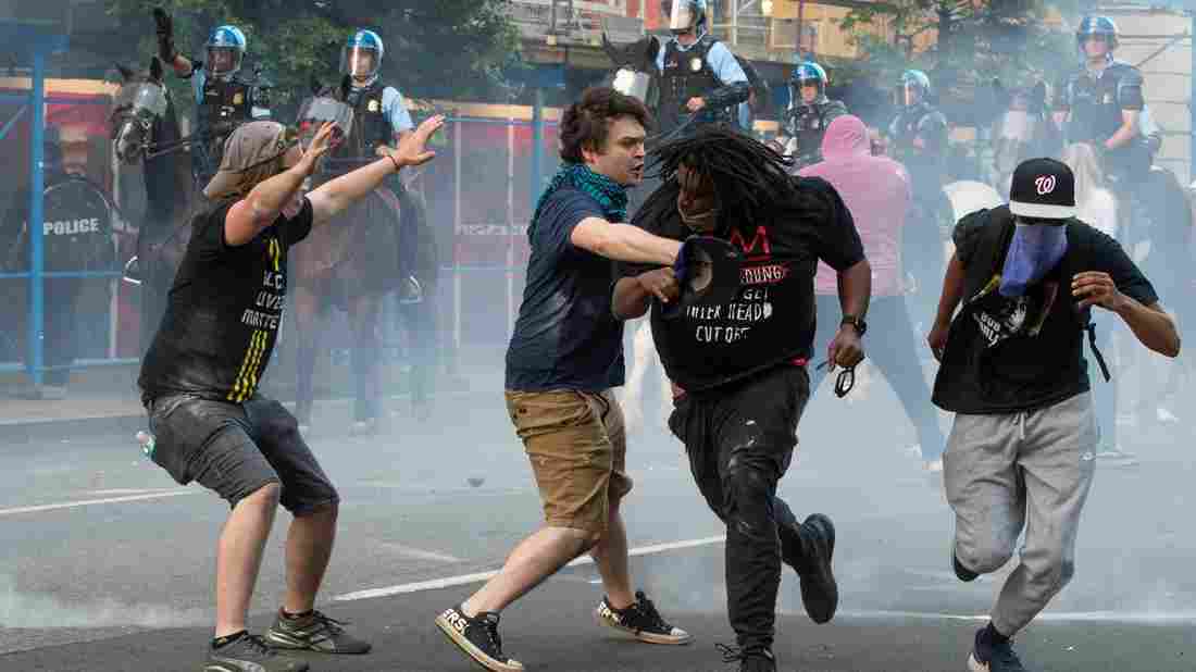Protesters are tear gassed as the police disperse them near the White House on June 1, 2020, as demonstrations against George Floyd's death continue. Police fired tear gas outside the White House late Sunday as anti-racism protesters again took to the streets to voice fury at police brutality. ROBERTO SCHMIDT/AFP via Getty Images hide caption