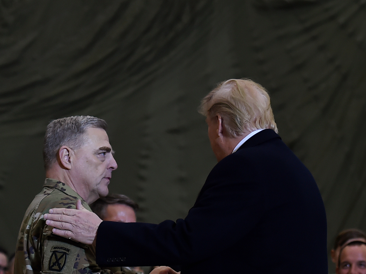 Former president Donald Trump shakes hands with then Joint Chiefs chairman General Mark Milley after addressing the troops at Bagram Air Field in Afghanistan during a surprise Thanksgiving day visit in 2019.
