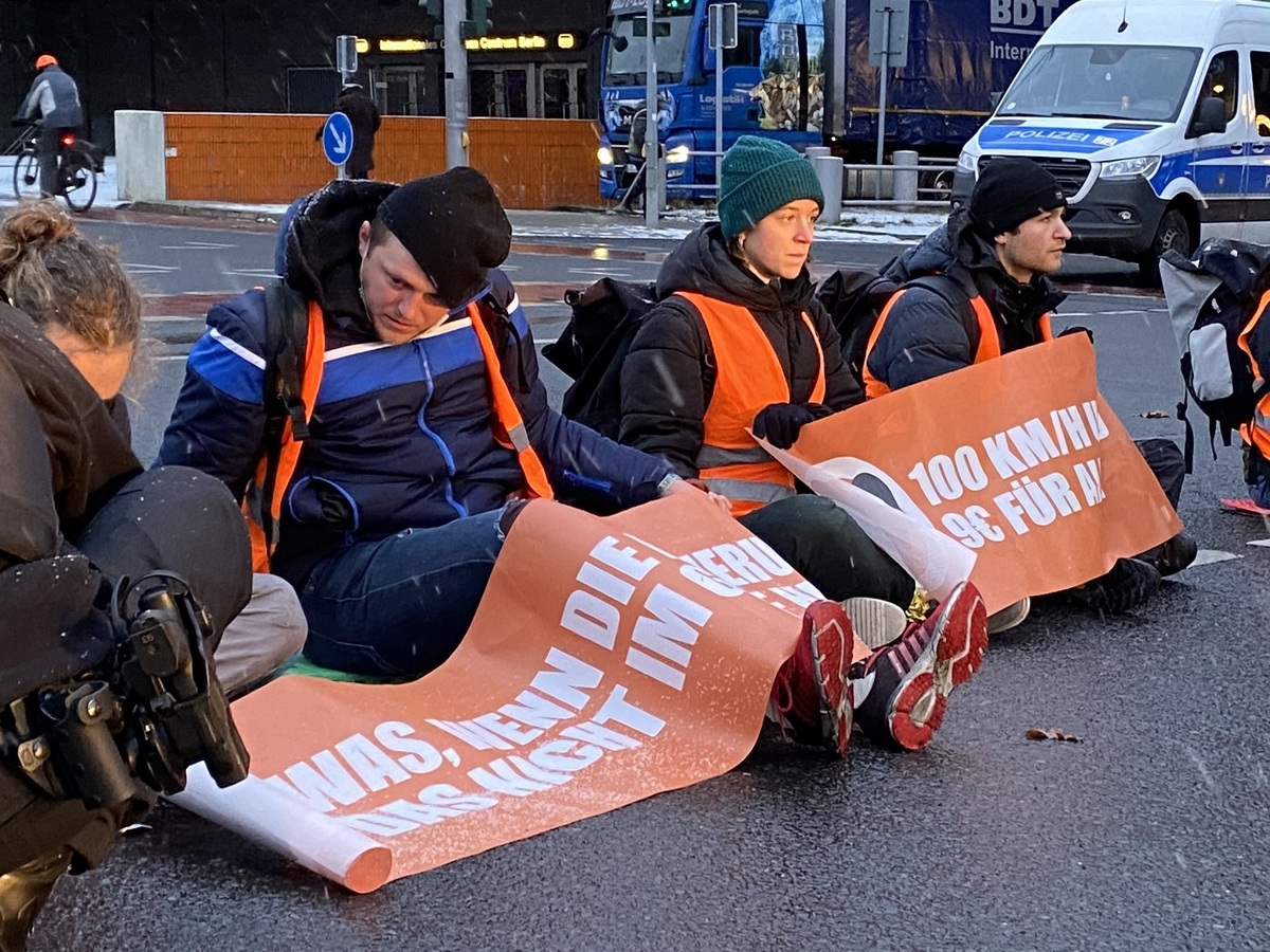 Climate activists from the group Letzte Generation (Last Generation) hold up commuter traffic on a Monday morning in Berlin by supergluing themselves to the road.