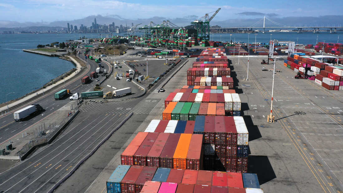 In an aerial view, shipping containers sit in dock at the Port of Oakland on September 09, 2021 in Oakland, California.