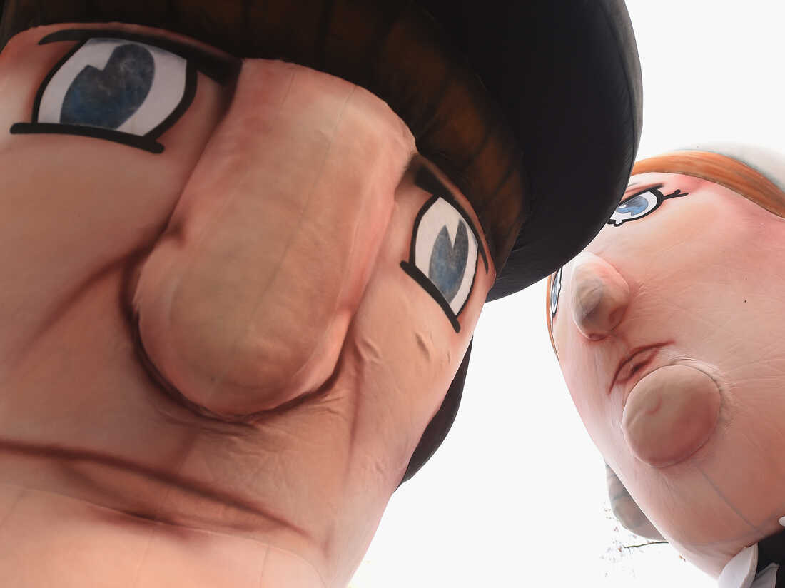 Pilgrim mascots take part in the 90th Annual Macy's Thanksgiving Day Parade on November 24, 2016 in New York City. Michael Loccisano/Getty Images hide caption