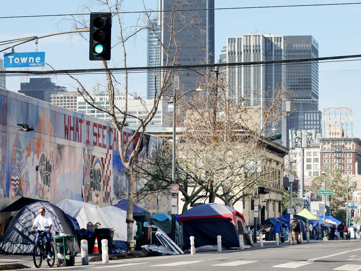 A homeless encampment lines a street in Skid Row in Los Angeles, California.