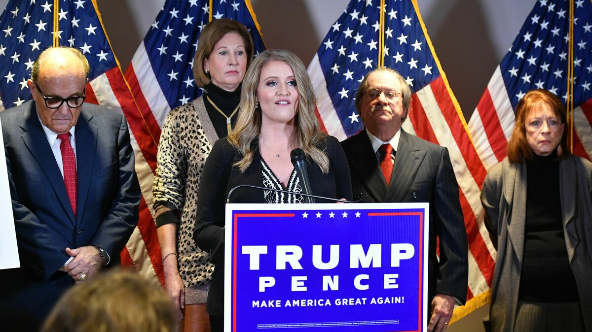 A November 19, 2020 photo shows attorney Jenna Ellis speaking during a press conference at the Republican National Committee headquarters in Washington, DC. Mandel Ngan/AFP via Getty Images hide caption