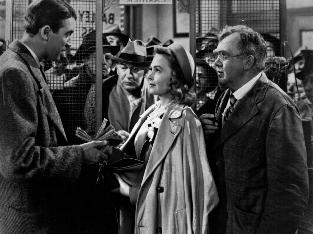 James Stewart, left, Thomas Mitchell, right, and Donna Reed appear in the 1946 movie "It's A Wonderful Life." (AP Photo) Anonymous/ASSOCIATED PRESS hide caption