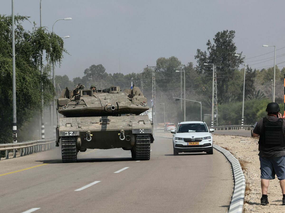 An Israeli tank drives on a road near Sderot on October 8, 2023. JACK GUEZ/AFP via Getty Images hide caption