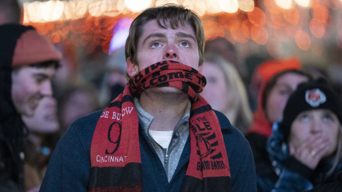 Cincinnati Bengals fans react to the team's loss against the Los Angeles Rams at end of NFL football's Super Bowl 56 Sunday, Feb. 13, 2022, at The Banks in Cincinnati. Jeff Dean/AP hide caption
